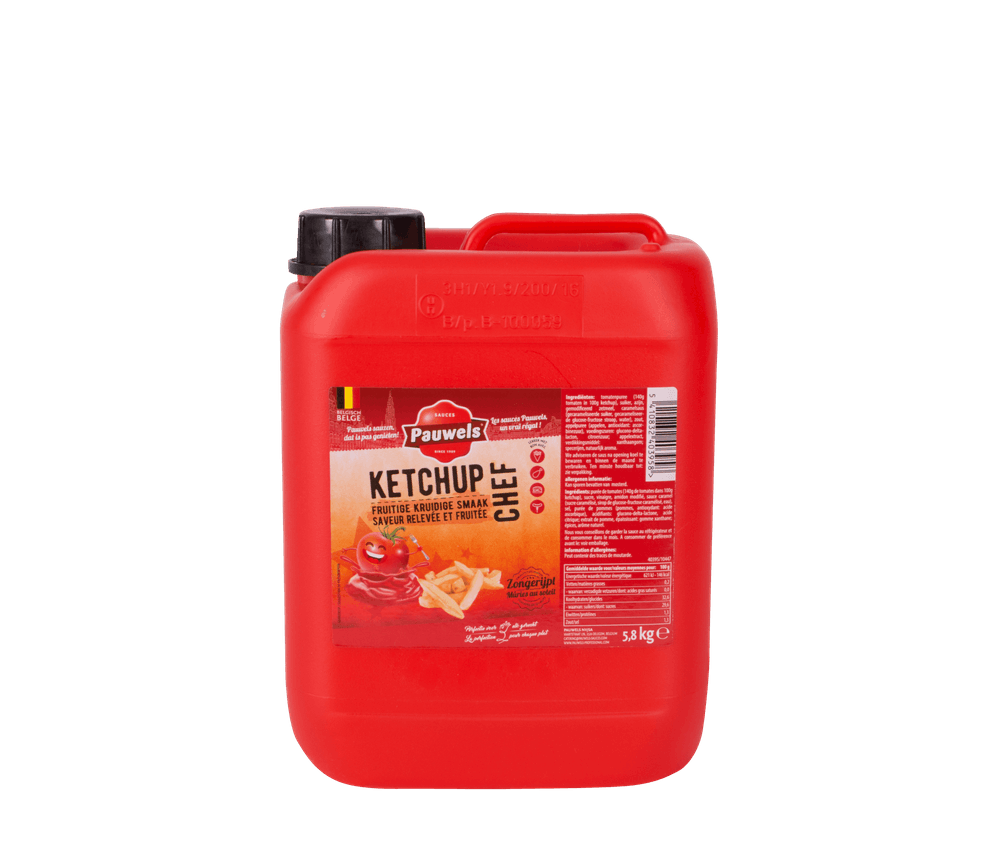 Glucose-fructosestroop, tomatenpuree (135g tomaten in 100g ketchup), azijn, karamel (glucosestroop, suiker, water), zout, gemodificeerd zetmeel, voedingszuren: melkzuur, citroenzuur; verdikkingsmiddelen: guarpitmeel, xanthaangom; conserveermiddel: kaliumsorbaat; specerijen, uienpoeder, appelsapconcentraat (glucosestroop, appelsapconcentraat).